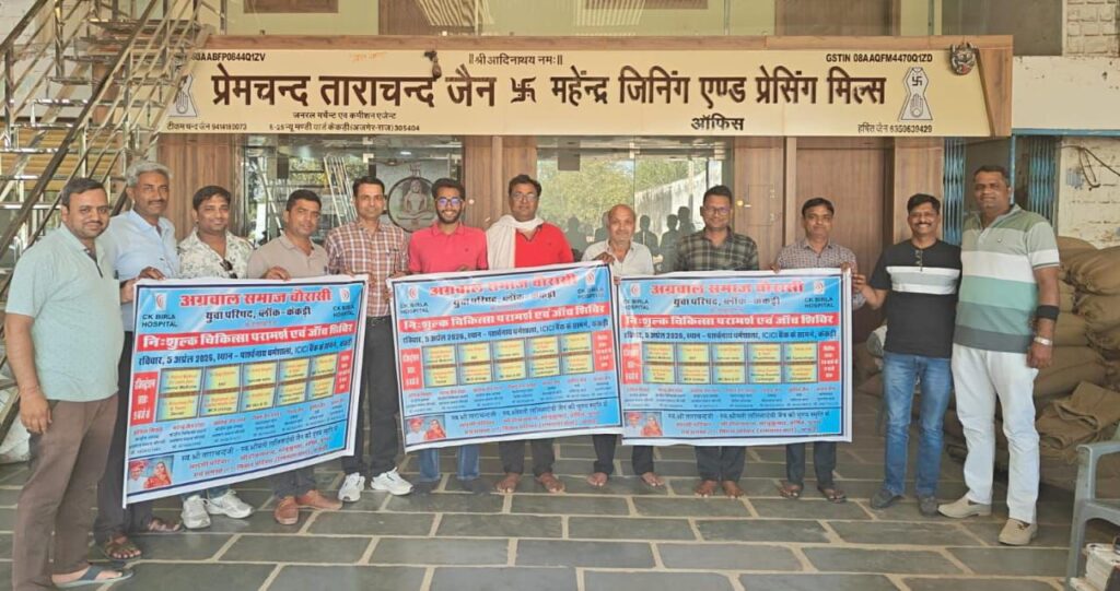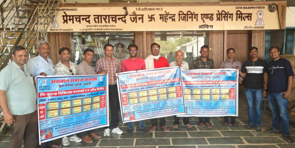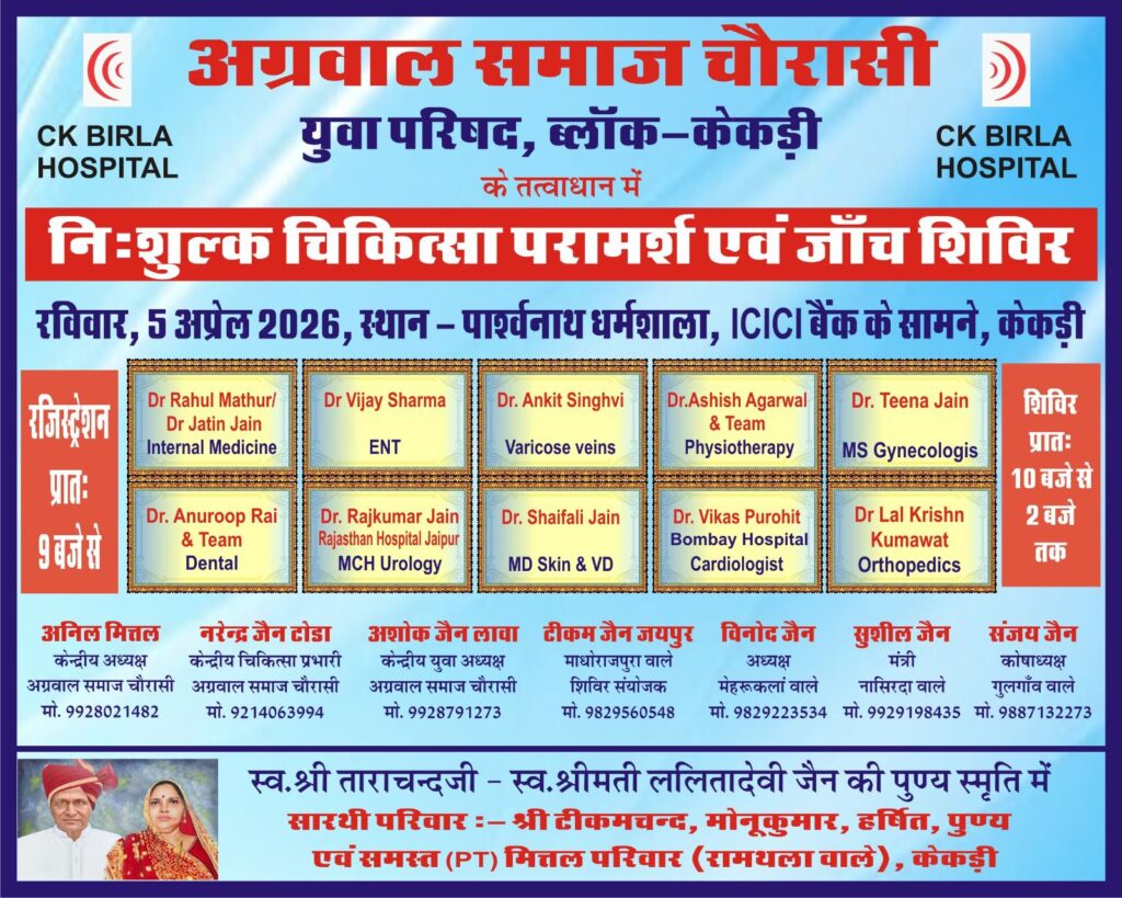 *अग्रवाल समाज चौरासी युवा परिषद, ब्लॉक-केकड़ी के तत्वावधान में आगामी रविवार, 5 अप्रैल 2026 को एक नि:शुल्क चिकित्सा परामर्श एवं जांच शिविर का आयोजन किया जाएगा*। *यह शिविर पार्श्वनाथ धर्मशाला, ICICI बैंक के सामने, केकड़ी में आयोजित होगा*।