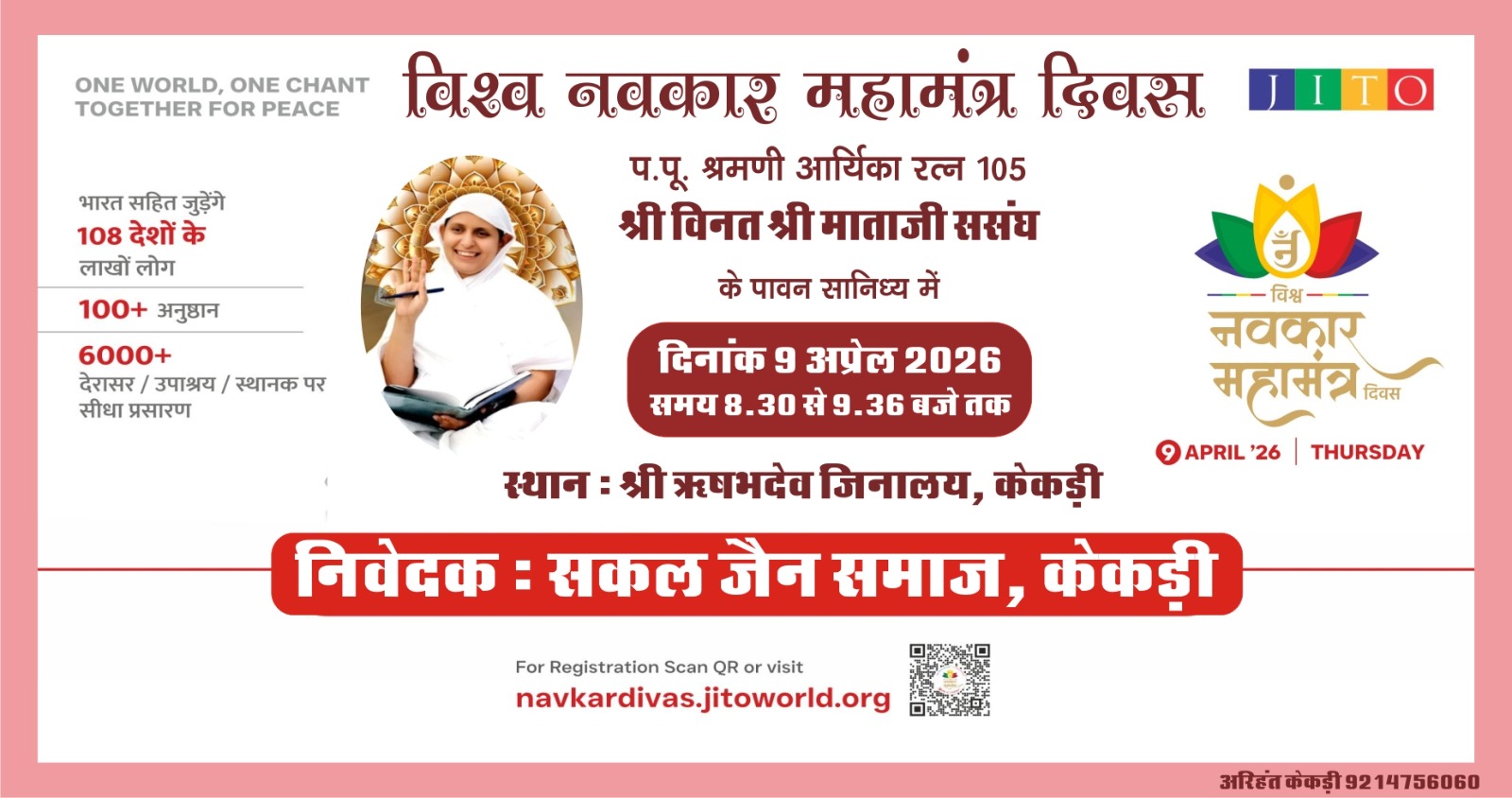 *सकल जैन समाज के तत्वावधान में विश्व नवकार महामंत्र दिवस 2.0 के अवसर पर 9 अप्रैल 2026, गुरुवार को प्रातः 8:30 बजे से 9:36 बजे तक श्री ऋषभदेव जिनालय, केकड़ी में भव्य कार्यक्रम का आयोजन किया जाएगा*।